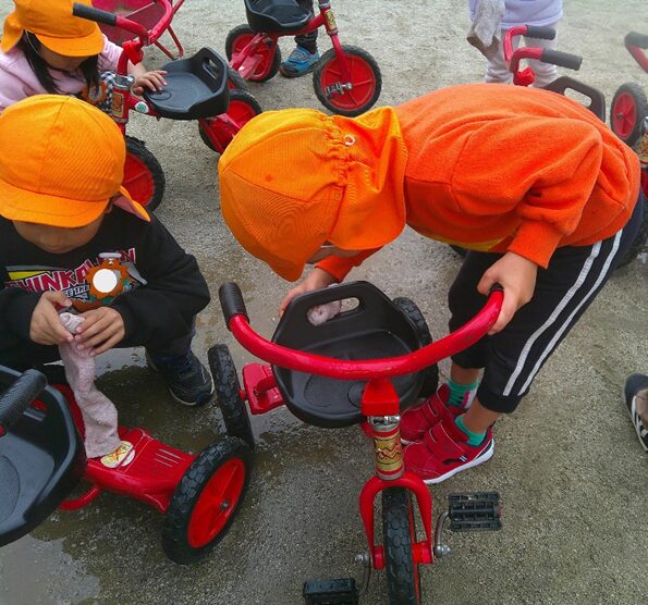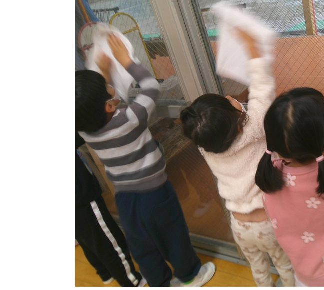 <大掃除> 外の乗り物洗い、窓拭き、床掃除、靴箱掃き、どれをとっても、すすんで拭く姿があり、頼もしい限りです。新年を気持ちよく迎えられます。