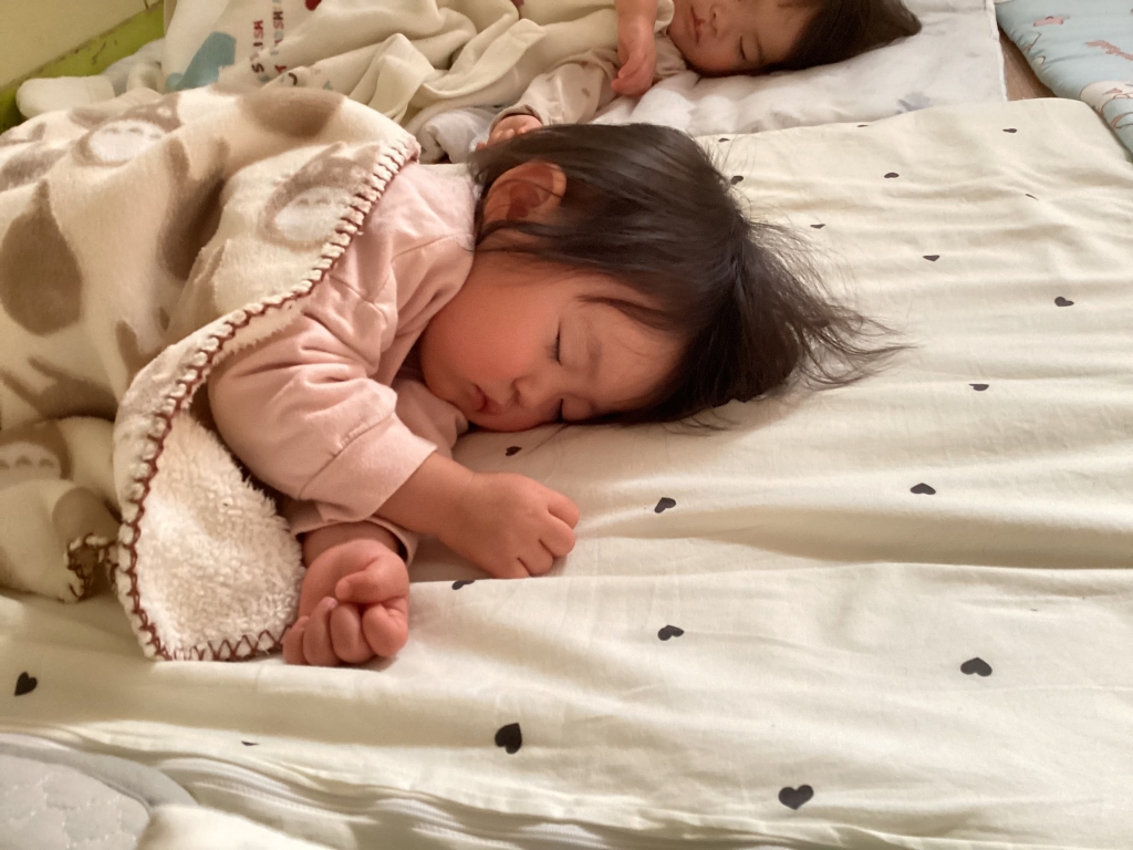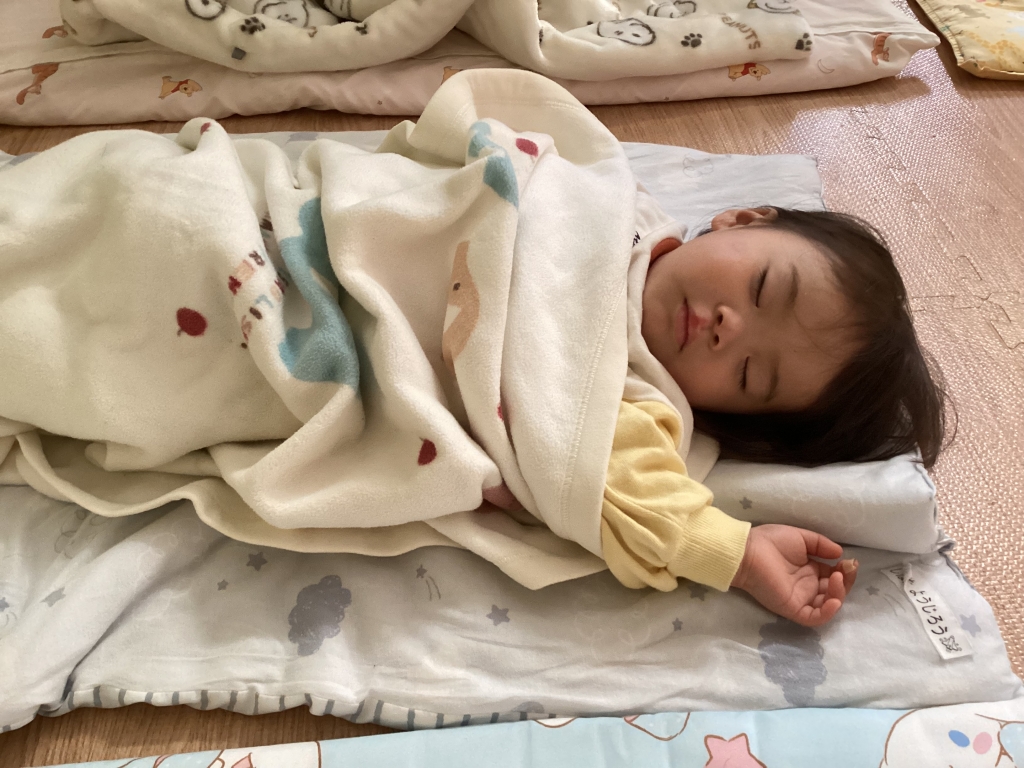 担任から優しくトントンしてもらい、みんなぐっすり眠っていますね。最初の頃はちょっとした物音ですぐに目が覚めていましたが、今ではぐっすり眠っています。どんな夢を見ているのかな?みんな可愛い寝顔ですね!