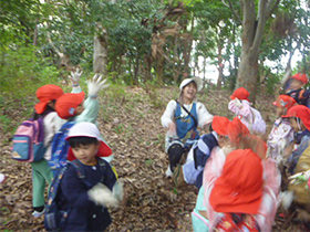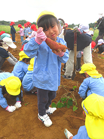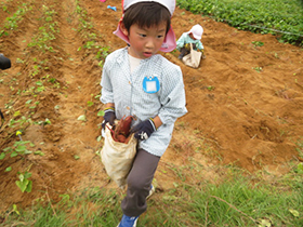 バスに乗って、雁ノ巣レクレーションセンターへ芋ほりに行きました。芋のつるを引っ張ったり土を掘ったり、力いっぱい頑張りました。たくさん収穫できて大満足の子どもたちでした。