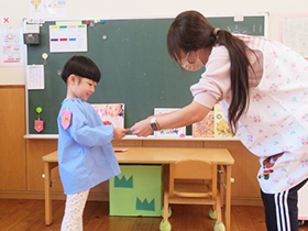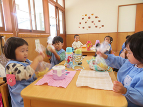 朝、おうちの人と離れる時には泣いているお友だちも、お部屋に着くと気持ちを整えておしゃべりしたり、歌をうたったり、ご飯を食べたりと楽しく過ごすことができています。