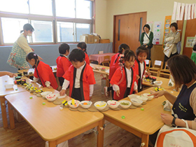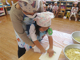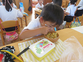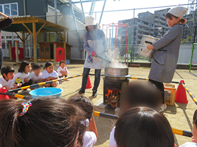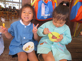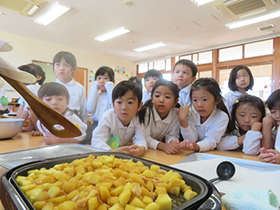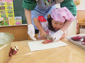 みんなで掘ったさつま芋を使って、各学年でクッキングを行いました。年少組は「さつまいものシュガースティック」、年中組は「蒸し芋」、年長組は「さつまいもご飯」を作りました。秋の実りを味わうことができました。