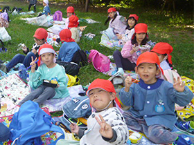 年中組、年長組それぞれで、幼稚園近くの道端や公園によもぎを摘みに行き ました。翌日よもぎ入り団子を作り、きな粉をかけて春の味を感じながらおいしくいただきました。