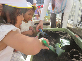 園庭のプランターや畑で育てている夏野菜が、連日のお天気でぐんぐん大きくなりました。実をつけると子どもたちも大喜び!暑さの中、水やりを欠かさず日々観察をし、食べごろになったところで収穫しました。