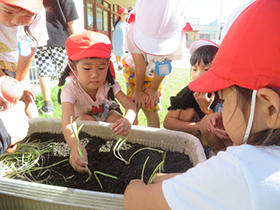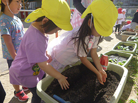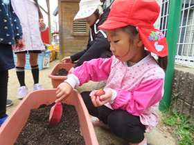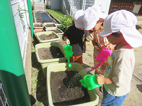 各クラスで育てたい冬野菜を話し合い、人参や大根、ブロッコリーなど、いろいろな野菜を育てることになりました。収穫を楽しみにしながら、水やりなどのお世話を頑張ります。