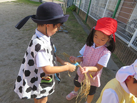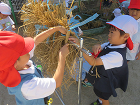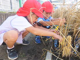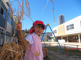 年長組で栽培していたもち米が実り、子どもたちが稲刈りを行いました。12月に脱穀・籾摺り・精米を行うまで、大切に干しておきます。