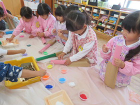 母の日、父の日に寄せて、おうちの方々へのプレゼント作りをしました。年少組は手形とスタンプの巾着袋、年中組はおうちの人の顔を描いたトートバッグ、年長組は絞り染めを作りました。絞り染めをする前にてるてる坊主を作り、輪ゴムで縛る工程を経験しました。