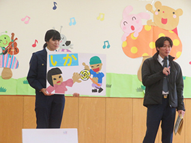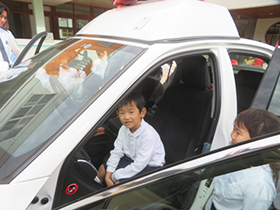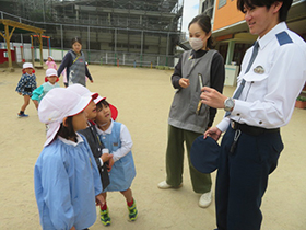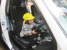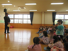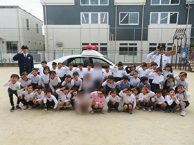 不審者が園内に入ってきたという想定で、避難訓練を行いました。園庭で遊んでいた子どもたちは急いで部屋の中に逃げ込み、身を守ることができました。今回は東警察署の方に来ていただき、自分の身を守るためのお約束などについての話をしてもらいました。憧れの警察官と話したりパトカーに乗らせてもらえたり、子どもたちはとても嬉しそうでした。