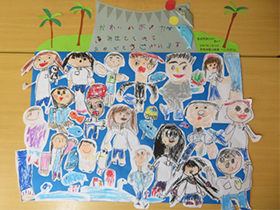 社会見学でマリンワールドに行かない年少組のために幼稚園にも水族館を作ろうと、年長組のみんなで協働制作を行いました。作りたい海の生き物でグループを決め、実際に見てきた海の生き物を思い出したり図鑑などで調べたりしながら、毎日少しずつ取り組んでいきました。