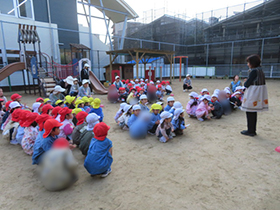 園庭で遊んでいる時に大きな地震が起きたという想定での避難訓練を行いました。揺れに耐えるための「カエルポーズ」の練習もしました。