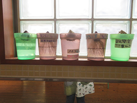 ふくおか環境財団の方が来てくださって、ダンボールコンポストの講習をしていただきました。コンポストとはどういうものなのか、真剣に話を聞いて学びました。早速、生ごみを混ぜ込んで堆肥作りスタートです。コンポストに名前をつけて、親しみを持って毎日混ぜていきます。できた堆肥は花や野菜作りにつなげていきたいと思います。